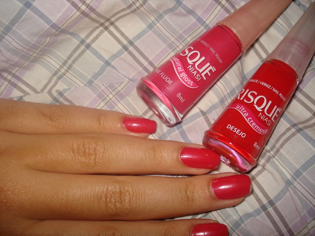 O esmaltee dessa semana é misturinha que eu adooooro! Vira e mexe eu tô com ela nas unhas! Passo uma camada do esmalte Desejo da Risqué e depois uma de Pink Fluor, também da Risqué. Fica assim ó: